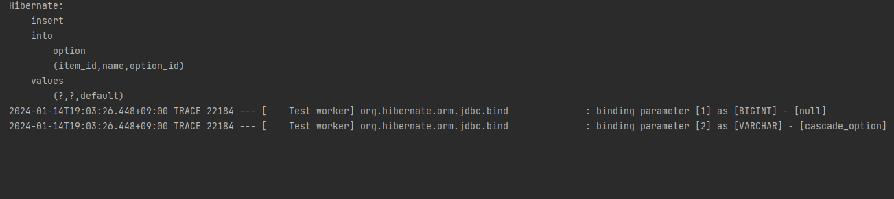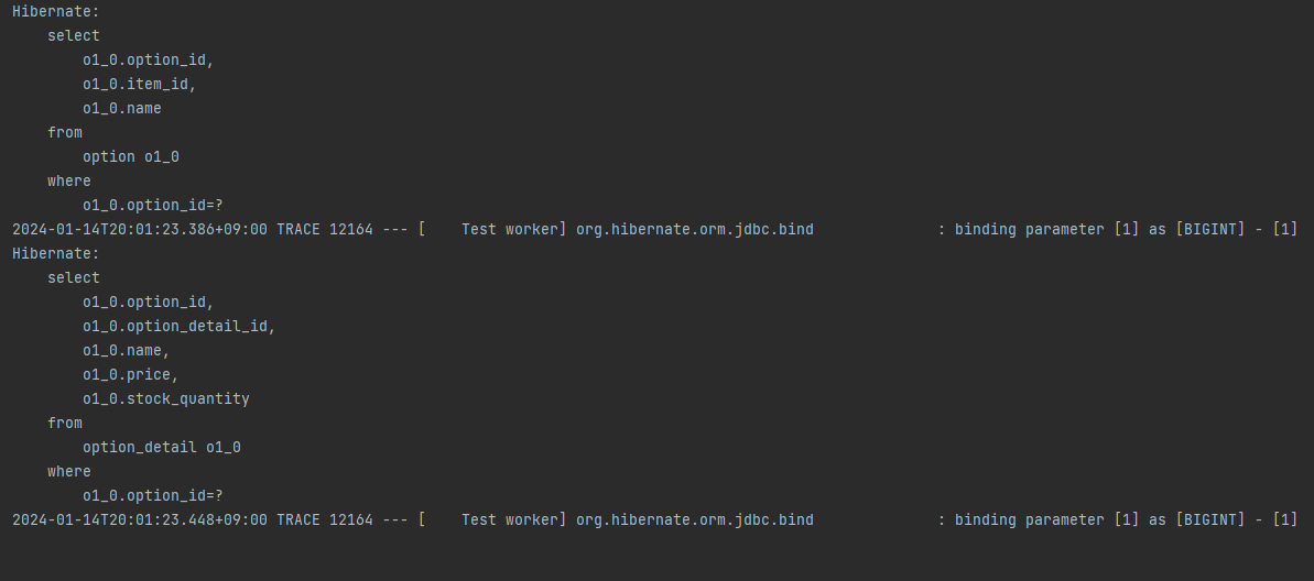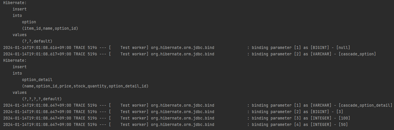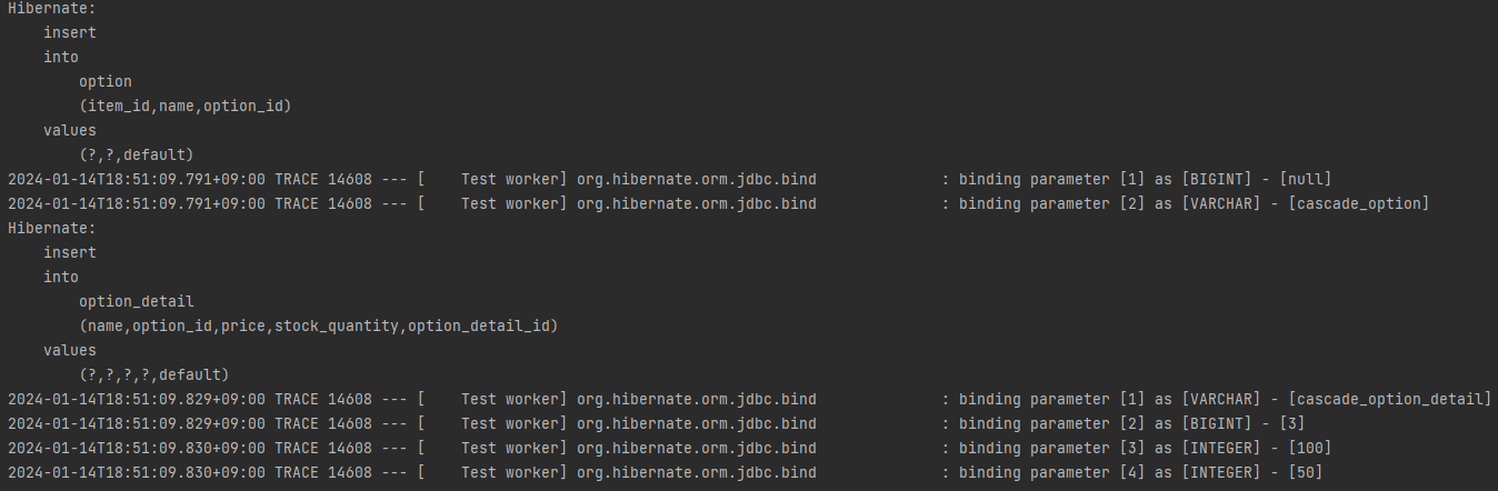 option 테이블에 대한 insert 쿼리만 수행되고, option_detail은 수행되지 않는 것을 확인할 수 있다.